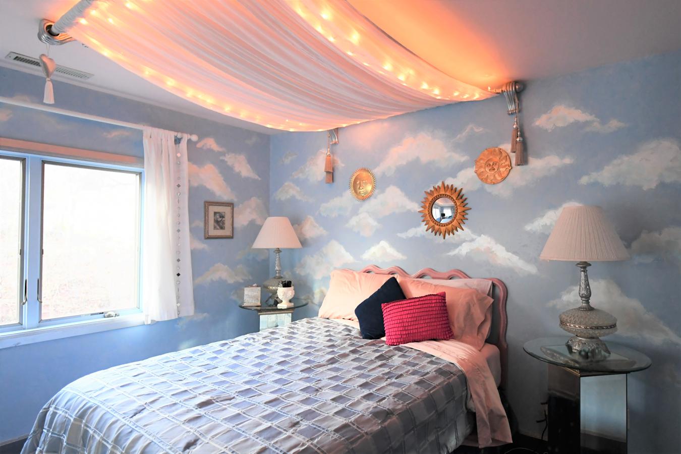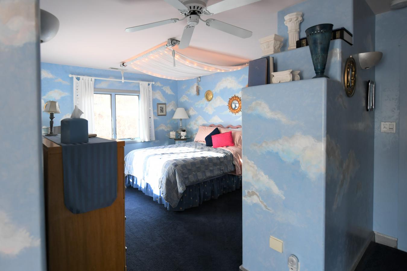 Dream under a filmy canopy in a sky blue room with handpainted clouds adrift on the walls. Bedside gas fireplace for warmth and romance on frosty nights.