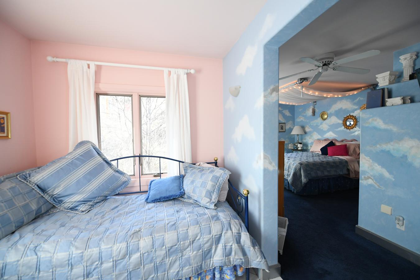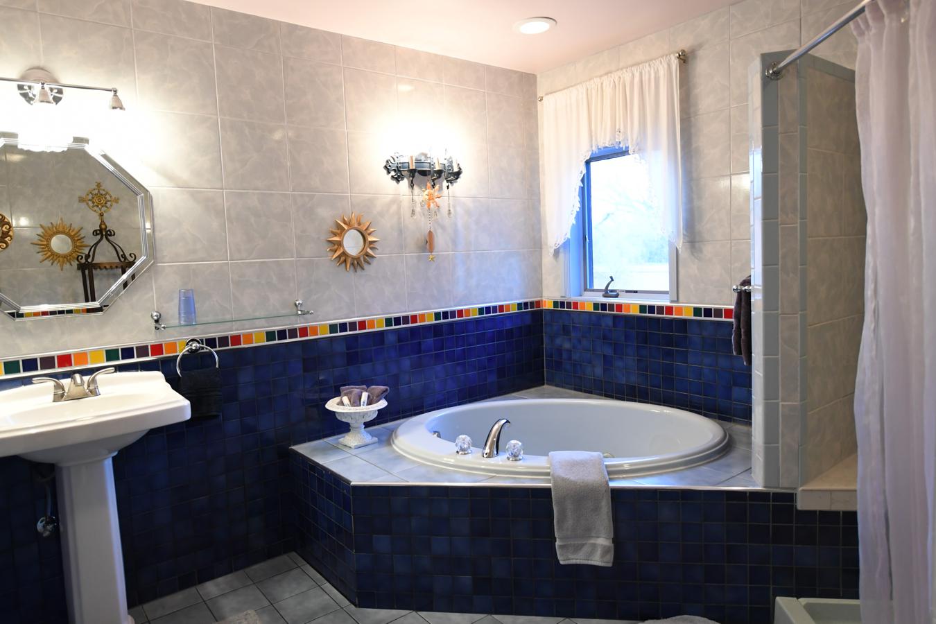 Bask in the large sun-filled sitting room, or unwind in the jetted tub-for-two in our bathroom tiled in many shades of blue with a dazzling rainbow border.