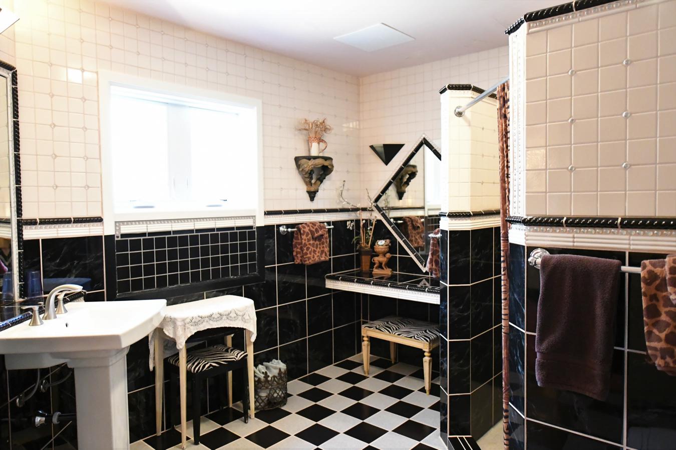 Hand painted tile and elaborate tiling featuring mirrors and inset jewels make this large bathroom a treat. It also has what we think is the all-time champion vanity of vanities.